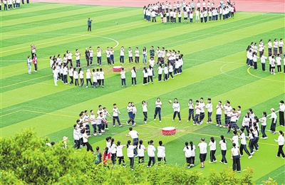 5月26日,赣州市章贡中学学生在进行趣味游戏比赛。当日,章贡中学举行“红色基因永传承 家校共育同心圆”第二届心理素质拓展运动会,通过百人动力圈、同心击鼓、齐心协力等丰富多彩的趣味游戏,释放学生情绪压力,提升心理健康意识,培养团队协作精神,营造积极向上的校园心理文化氛围。特约记者胡江涛 摄