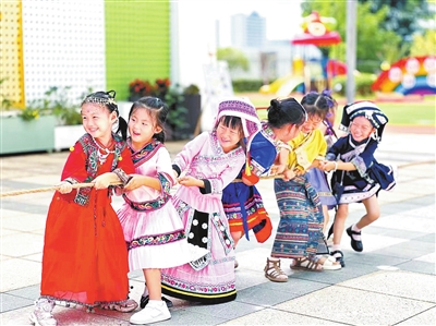 近日,信丰县高新区幼儿园的孩子们身穿民族服饰,在进行跳竹竿、拔河等游戏,脸上洋溢着幸福快乐的笑容。