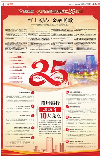 2025年,在各级党委政府的坚强领导、监管部门的悉心指导、广大客户的信任支持下,赣州银行坚守“金融为民”的初心,紧扣江西省“1269”、赣州市“7510”行动计划,以“闯”的魄力开拓市场,以“创”的智慧驱动转型,以“干”的作风夯实基础,在资产规模、盈利水平、服务实体、零售转型、数智化建设等多个领域取得了累累硕果,实现了历史性突破,在高质量发展道路上迈出了坚实的步伐。