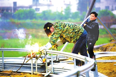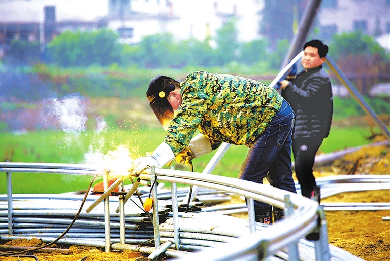 3月18日,在大余县樟斗镇樟斗村高标准农田建设项目施工现场,工人正在焊接蔬菜大棚钢架。连日来,该县在抓好疫情防控的同时,精准施策,加强与施工企业沟通,提供全方位服务,推进高标准农田建设项目复工复产,全力保障春耕生产。叶功富 摄