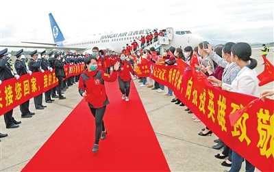 三月二十三日下午,赣州支援湖北医疗队圆满完成任务平安归来,队员们飞抵赣州黄金机场时,受到家乡人民的热烈欢迎。