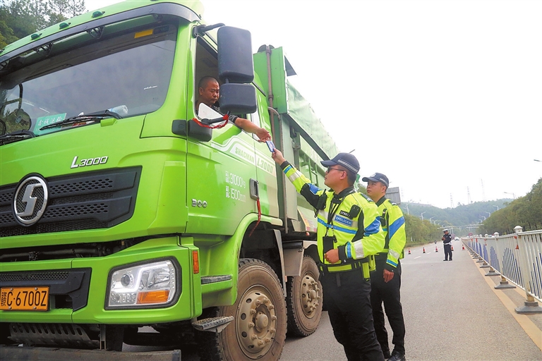 为切实做好交通事故预防工作,连日来,上犹县公安局交管大队集中开展统一行动,严格大货车、面包车等重点车辆管理,严厉查处超限超员超载、涉牌涉证、酒驾醉驾等重点交通违法行为。图为执勤民警正在对过往车辆进行检查。