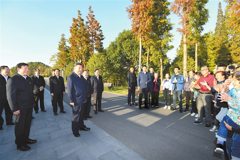 正在江边休闲散步的市民看到总书记来了,纷纷向总书记问好。习近平同大家亲切交流,对大家说,40多年前我来过五山地区,对这里壮阔江面的印象特别深刻。这次来,看到经过治理,曾经脏乱差的环境发生了沧桑巨变,成为人们流连忘返的滨江生态公园。大家生活在这样的城市里很幸福,幸福是你们共同奋斗、亲手创造出来的。习近平指出,城市是现代化的重要载体,也是人口最密集、污染排放最集中的地方。建设人与自然和谐共生的现代化,必须把保护城市生态环境摆在更加突出的位置,科学合理规划城市的生产空间、生活空间、生态空间,处理好城市生产生活和生态环境保护的关系,既提高经济发展质量,又提高人民生活品质。当前,境外疫情仍在蔓延,我国外防输入、内防反弹压力还很大。希望大家始终不放松疫情防控这根弦,继续落实各项常态化疫情防控措施,坚决防止疫情出现反复。
