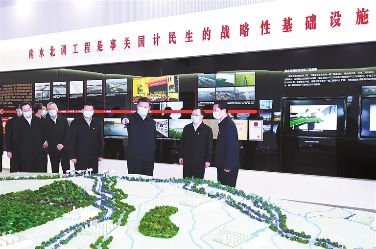 在江都水利枢纽展览馆,习近平边走边看,详细了解水利枢纽发展建设历程和发挥调水、排涝、泄洪、通航、改善生态环境等功能情况。习近平指出,“北缺南丰”是我国水资源分布的显著特点。党和国家实施南水北调工程建设,就是要对水资源进行科学调剂,促进南北方均衡发展、可持续发展。要继续推动南水北调东线工程建设,完善规划和建设方案,确保南水北调东线工程成为优化水资源配置、保障群众饮水安全、复苏河湖生态环境、畅通南北经济循环的生命线。要把实施南水北调工程同北方地区节约用水统筹起来,坚持调水、节水两手都要硬,一方面要提高向北调水能力,另一方面北方地区要从实际出发,坚持以水定城、以水定业,节约用水,不能随意扩大用水量。习近平强调,南水北调东线工程取得的重大成就,离不开数十万建设者长期的辛勤劳动,离不开沿线40万移民的巨大奉献。要依托大型水利枢纽设施和江都水利枢纽展览馆,积极开展国情和水情教育,引导干部群众特别是青少年增强节约水资源、保护水生态的思想意识和行动自觉,加快推动生产生活方式绿色转型。