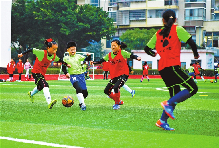 近日,赣州市文清路小学(豪德校区)足球场上,学生们正在进行足球比赛。近年来,章贡区大力推行足球进校园活动,让学生在足球运动中享受乐趣、增强体质。目前,该区现有各级青少年校园足球特色学校11所,其中全国青少年校园足球特色学校8所。