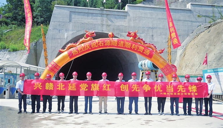 兴赣北延项目沿线地形复杂,桥梁隧道比例高,施工条件差。开工建设伊始,赣州交控集团党委坚持把党支部建在项目一线,项目建设和组织建设同步,抽调精兵强将组建项目办进驻边远山区兴国县良村镇。党支部按照党建标准化、规范化要求,完善各项规章制度,广泛开展项目党员“亮身份、亮形象、亮标准、亮承诺”活动,在征地拆迁、项目施工、技术攻关等工作一线设立党员责任区、创建党员示范岗、组建党员突击队,做到关键岗位有党员、困难面前有党员、突击攻关有党员。党员干部勇挑重担,迅速组织各参建单位深山集结,由此拉开了长达3年的攻坚战。