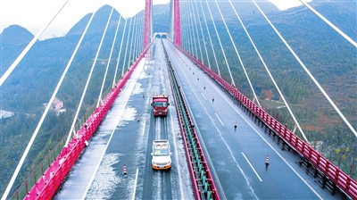 1月7日,贵黔路政执法大队工作车引导撒盐车通过鸭池河大桥(无人机照片)。当日,受强冷空气影响,贵州省多地出现雨雪天气和道路凝冻情况。贵州省交通部门开展撒盐除冰作业,全力保障道路畅通安全。