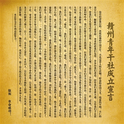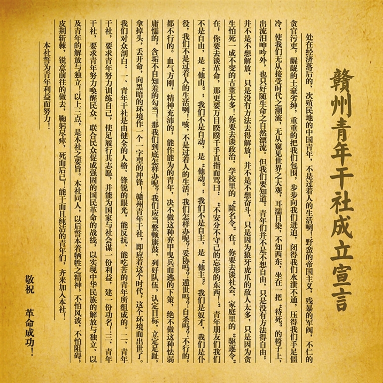 与此同时,赣州特支还领导了青年学生和妇女运动。11月,赣州特支领导成立了共青团的外围组织赣州青年干社。赣州青年干社发布宣言,将进步青年吸引到自己周围,并在兴国、于都等县设立分社。经过革命风浪的洗礼,青年干社的许多成员被发展为共产党员、共青团员,成长为各地革命运动的中坚力量,为赣南革命斗争带来了一股清新、鲜活的气息。同时,赣州特支领导成立了赣州妇女解放协会,从组织上保障了妇女运动的开展。赣州妇女解放协会为提高妇女文化水平,创办了平民女校,开设了国文、算术、尺牍、缝纫、家务等课程;还广泛参与社会活动,向妇女宣传男女平等。广大妇女在血雨腥风的革命斗争中,成为反对帝国主义、反对封建主义、反对军阀专制斗争的一支重要力量。