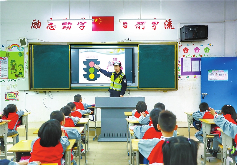 3月1日,在全南县第二小学,该县公安局交管大队民警向孩子们宣讲交通安全知识。该大队民警走进各中小学,开展“开学第一课”交通安全宣传活动,进一步提高中小学生交通安全意识,增强自我保护能力,预防交通事故。