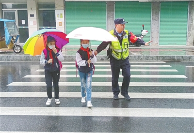 近日,赣州市公安局巡警支队巡逻一大队民警护送放学的学生过马路。该大队联合章贡区解放街道姚衙前社区、嵯峨寺小学启动了“大手牵小手,雏鹰护学志愿服务行动”,推动“我为群众办实事”活动深入开展。