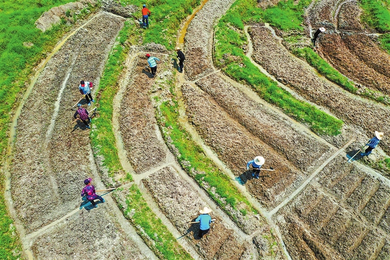 4月22日,章贡区水西镇上禾村村民正忙着翻地种植生姜。连日来,该镇抢抓有利时机,组织党员干部下沉一线指导生姜种植,全力做好农业生产工作。胡江涛 陈路 摄