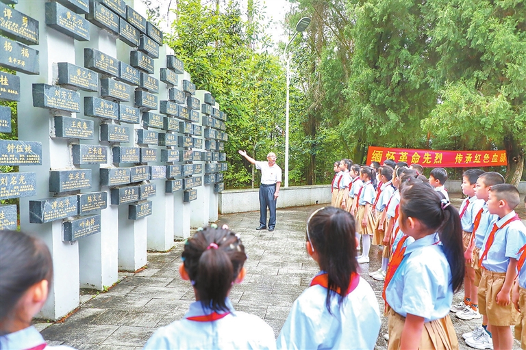 ↑4月26日,全南县实验小学学生在梅子山革命烈士纪念墙前聆听红色故事。连日来,该县各中小学通过组织师生瞻仰革命烈士纪念碑、听红色故事等形式,庆祝中国共产党成立100周年。 尹其奇 摄
