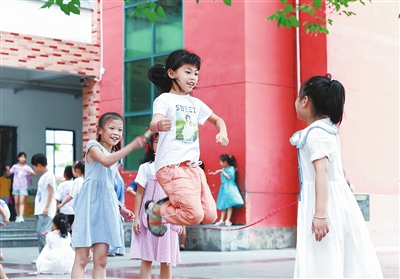 学生日前在兴国县实验小学的操场上跳绳。为满足广大家长需求,解决学生暑期“看护难”问题,兴国县已启动校内托管服务试点工作,为学生提供文体活动、阅读指导、综合实践、兴趣拓展等校内托管服务。