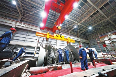 →近日,工人在华能秦煤瑞金电厂二期扩建工程进行汽轮机本体安装。该工程总投资70亿元,是华能集团落实“央企入赣”投资的项目,也是省、市重点工程。据悉,该工程四号机组已进入并网调试阶段,预计年底投产。刘一泽 记者吴悦 摄