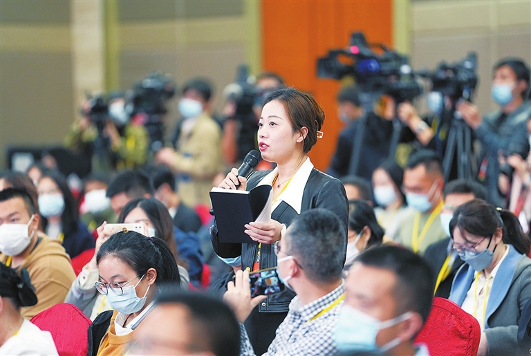 10月18日,中国共产党第二十次全国代表大会新闻中心举行集体采访。黑龙江、上海、江苏、浙江、安徽、福建、江西代表团新闻发言人出席,介绍代表团学习讨论二十大报告情况,并回答记者提问。这是记者在分会场提问。