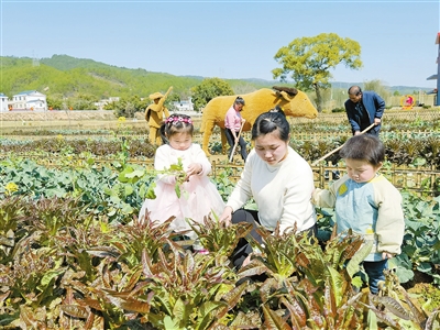 2月18日,游客在亲子农场体验蔬菜采摘乐趣,感受田园生活。信丰县西牛镇利用生态、交通等优势,大力发展农旅产业,打造了集休闲观光、研学旅游、劳动体验为一体的双溪农旅乐园,吸引周边游客游玩,带动近百名村民就业,助力乡村振兴。记者朱俊兴 通讯员陈畴全 摄