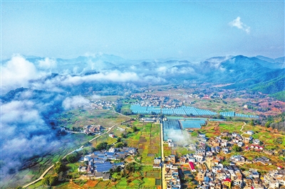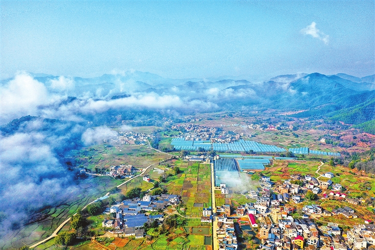 2月16日,全南县金龙镇水口村,民居与蔬菜产业基地、蓝天、青山和纵横交错的道路,勾勒出美丽的乡村田园风景画,美不胜收。尹其奇 肖玉 摄