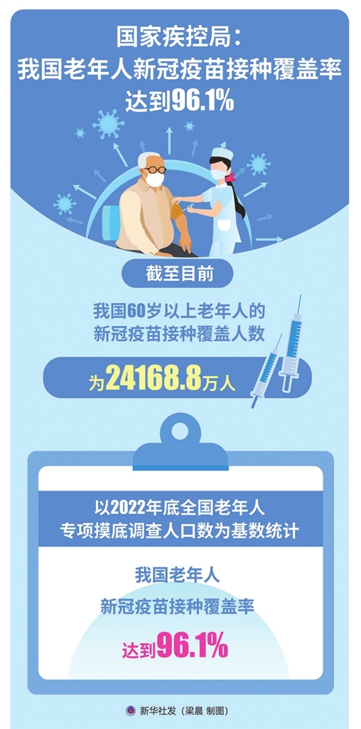 国家疾控局监测预警司司长杨峰在23日举行的国务院联防联控机制新闻发布会上公布,截至目前,我国60岁以上老年人的新冠疫苗接种覆盖人数为24168.8万人,以2022年底全国老年人专项摸底调查人口数为基数统计,我国老年人新冠疫苗接种覆盖率达到96.1%。