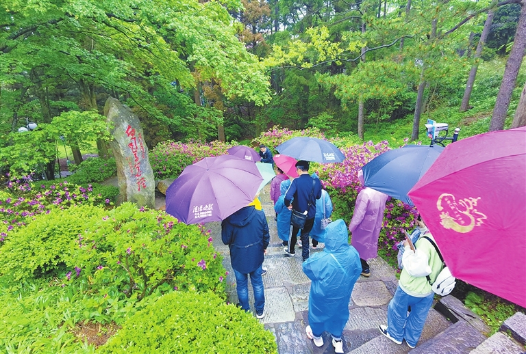 “人间四月芳菲尽,山寺桃花始盛开。”导游站在白居易草堂前讲述“诗魔”的传奇经历,引得大家驻足静听,在生动的解说中畅想白居易悠游大林寺,看桃花夭夭,艳艳灼灼,悠然而自得。