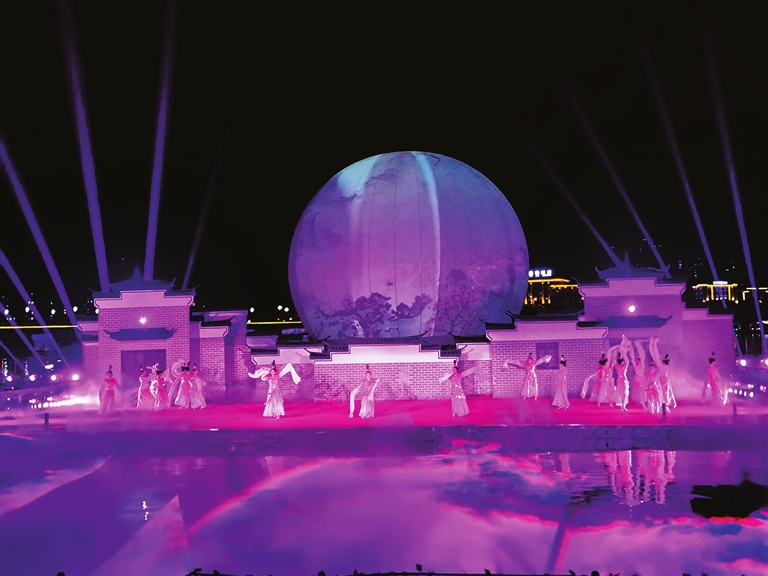 华灯初上,采风团一行乘画舫欣赏美景与特色桥梁,感受地方特色民俗文化魅力。随后,一场《遇见武宁》大型实景水秀让大家穿越古今,通过溯源武宁、追梦武宁、律动武宁、山水武宁四幕,结合武宁的打鼓歌、草龙舞等民俗,通过声、光、电、水雾等表现形式,全面展现了武宁的悠久历史文化和新时代发展面貌。