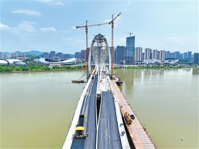 5月19日,于都县贡江河上,中铁二十四局的工人在安装于都集结大桥索塔拉索,桥面沥青摊铺同步进行。该桥全长约960米,宽约25.5米,双向4车道,计划今年上半年竣工投入使用,届时可实现于都县城区贡江两岸新旧城区的快速交通转换,便于群众出行。特约记者朱海鹏 摄