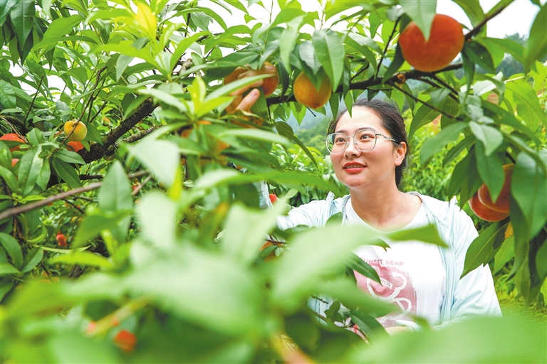 5月19日,游客在全南县龙源坝镇镇头村采摘贵妃红桃。该县以“一村一品、一村一特”发展思路,积极探索生态农业发展新路径,大力推动农旅融合发展,有效推动农村增绿、农业增效、农民增收,助推乡村振兴。李凡钦 摄