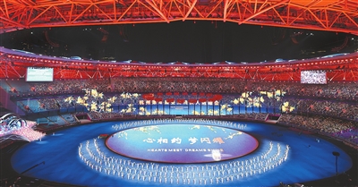 在激情的手鼓声中,文艺表演《梦闪耀》呈现在观众面前。百名手持金桂花环的演员加油呐喊,看台上“千家万户”的门窗点亮。沸腾之声稍歇,由听障儿童组成的童声合唱团,唱响一曲温暖的天籁之声。歌声中,肢残舞者与健全舞者默契携手、精彩共舞。