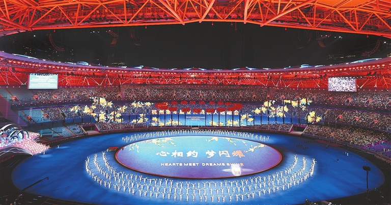 杭州奥体中心体育场灯火璀璨,流光溢彩,宛如一朵美丽的“大莲花”。现场4万多名观众欢声笑语,共同分享这一难忘时刻。