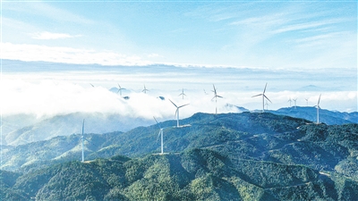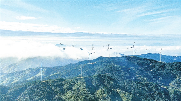 近日,记者拍摄的定南县岭北镇云台山风力发电场。近年来,该县坚持生态优先、绿色发展理念,充分利用高山丰富的风力资源,发展风电产业,有效促进区域节能降耗、低碳减排,实现生态保护和可持续发展。特约记者詹继成 摄