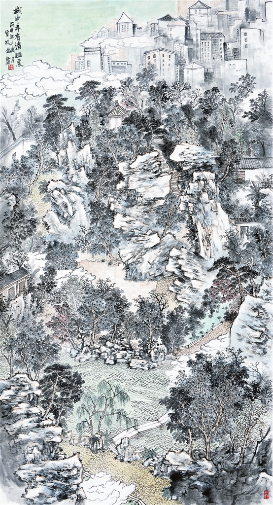 赏画:曾纪全创作的国画作品《城中亦有清幽处》,把公园的景致和现代城市相结合,仿佛在喧嚣的城市中寻找到一方心灵的栖息地。同时,作品在“闹”中将公园表现得安静且充满生机,看似漫不经心的布局,却经营出一片和谐天地,抒发了作者独特的审美情趣。(章美)