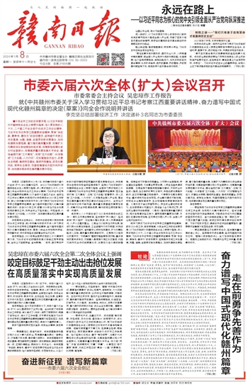 发展的浪潮奔涌向前,奋斗的脚步永不停歇。在全市上下深入贯彻落实党的二十大精神和习近平总书记考察江西重要讲话精神、昂首阔步奋进中国式现代化新征程的关键时刻,1月7日,市委六届六次全会在赣州召开。我们要切实把思想和行动统一到全会精神上来,聚焦“走在前、勇争先、善作为”的目标要求,纵深推进“三大战略、八大行动”,加快建设革命老区高质量发展示范区,奋力谱写中国式现代化赣州篇章。
