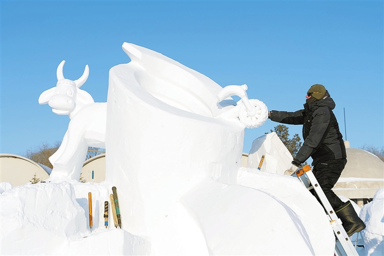 1月7日,选手在哈尔滨太阳岛雪博会园区进行雪雕创作。第26届中国·哈尔滨国际雪雕比赛正在哈尔滨太阳岛雪博会园区举行,来自12个国家的雪雕艺术家在寒风中精雕细琢,比拼创意和技巧。 新华社记者王大禹 摄