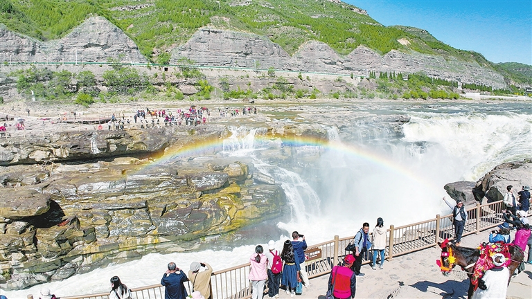四月二十三日,游客在山西吉县黄河壶口瀑布观赏“清流飞瀑”景观(无人机照片)。