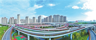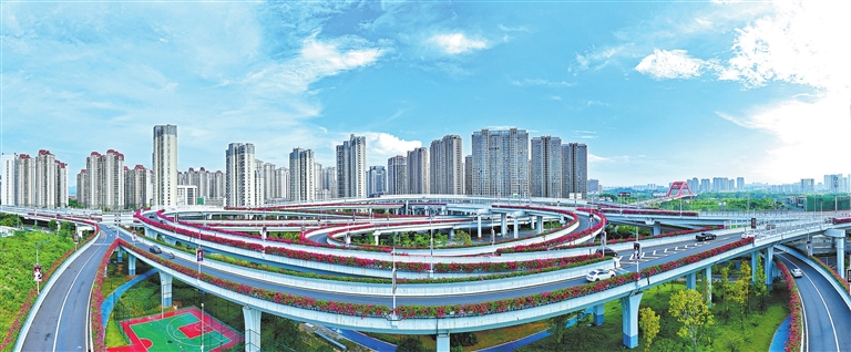 8月15日,车辆驶经赣南大道快速路新世纪立交桥上的“空中花路”。立秋以来,新世纪立交桥上的三角梅竞相绽放,让过往司机共享一道赏心悦目的风景,感受到美丽赣州的魅力。记者刘凯 通讯员曾宪涛 摄