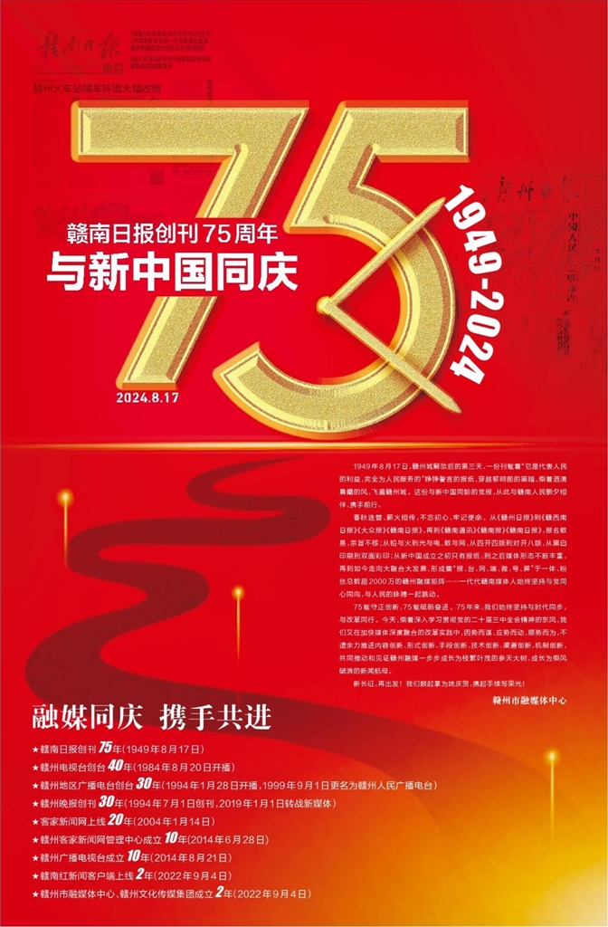 75载守正创新,75载砥砺奋进。75年来,我们始终坚持与时代同步,与改革同行。今天,乘着深入学习贯彻党的二十届三中全会精神的东风,我们又在加快媒体深度融合的改革实践中,因势而谋、应势而动、顺势而为,不遗余力推进内容创新、形式创新、手段创新、技术创新、渠道创新、机制创新,共同推动和见证赣州融媒一步步成长为枝繁叶茂的参天大树,成长为乘风破浪的新闻航母。
