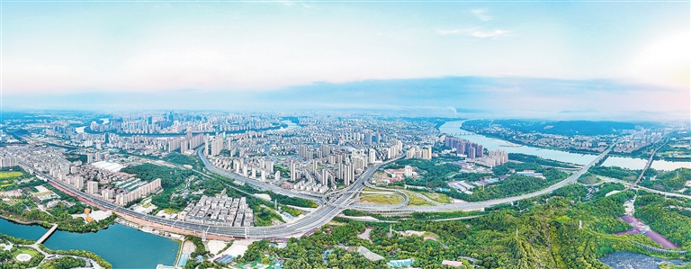 近日,记者航拍的赣南大道高架快速路和迎宾高架快速路。截至目前,赣州市中心城区快速路及连接线总里程达127公里,构成了“三横三纵”快速路网结构,为促进中心城区“五区一体化”联动发展、提升城市能级、建设革命老区高质量发展示范区注入了强劲动力。记者邹忠辉 摄