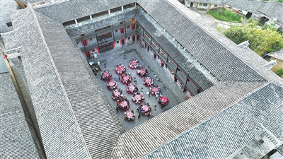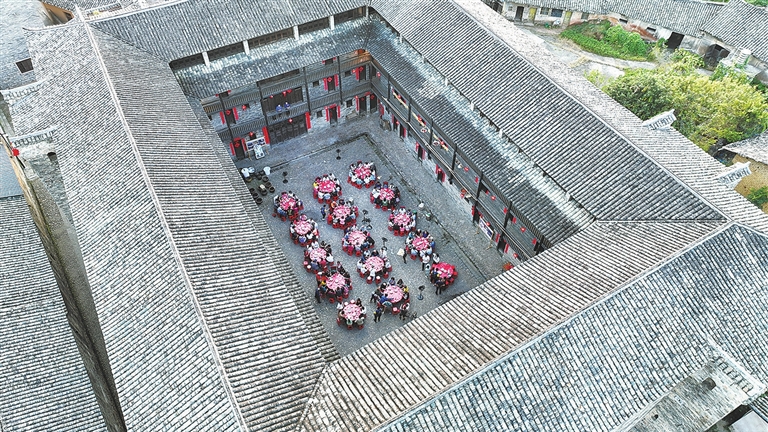 自10月以来,龙南市杨村镇太平古镇热闹非凡,从“舞龙引客”到“唱山歌”再到“安席、入席”等集民俗文化于一体的特色“围屋村席”活动吸引了1.2万余名游客前来体验。图为近日来自粤港澳大湾区的游客在体验“围屋村席”活动。唐智 摄