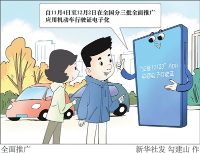 据新华社电 记者11月3日从公安部获悉,为进一步扩大改革惠及面,公安部部署自11月4日至12月2日在全国分三批全面推广应用机动车行驶证电子化,进一步简化办事手续资料,提升证件使用便捷度,更好便利群众办事出行。车主可以对照本地启用时间安排,通过全国统一的“交管12123”App申领电子行驶证。