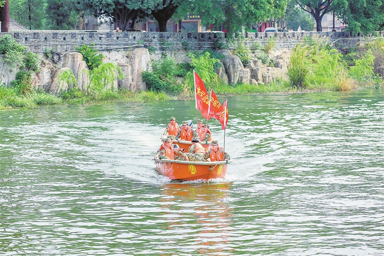 近日,大余县组织应急管理局、水利局、人武部等部门开展防汛抗洪救灾综合演练,围绕冲锋舟水上编队、洪水围困群众救援等科目进行训练,切实提高联合应急救援水平,确保人民群众生命财产安全。图为救援队员在大余县南安镇章水流域开展水上应急救援演练。特约记者叶功富 通讯员叶相发 摄