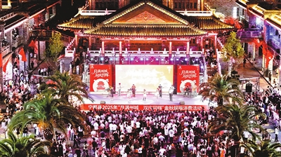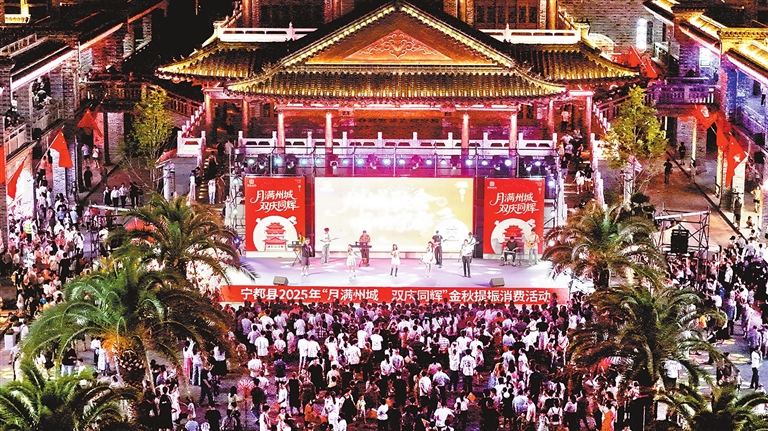 10月1日,游客在宁都州城文化街品美食、看演出。“双节”期间,宁都县举办“月满州城·双庆同辉”金秋提振消费活动,深度整合商贸、文旅等资源,通过发放消费券、满减折扣等惠民方式,推出一系列促消费活动,吸引众多市民游客参与。