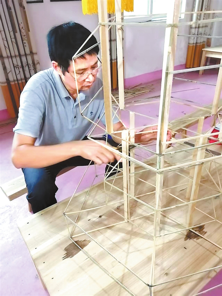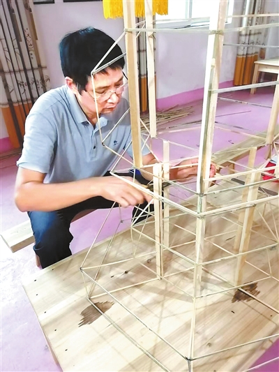 “灯架绑扎,先要搓好棉纸绳。搓绳技术性强,需长期练习才能掌握。绑扎时要注意接口衔接得当,操作谨慎。同时根据纸绳松紧顺序绑扎,边圈边用手搓拉,确保扎紧扎牢。”