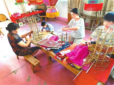 “最后一道工序是糊贴,这是决定花灯形态美不美观的关键。需灵活协调色彩,以彩纸或绸布下料,按具体形态着色,根据物体形象特征配置色调,达到立体平贴、协调统一的效果。要把握好每块布、纸的软度与空间,糊量适中,贴出整体完美灵动的形体。”刘云武指着刚完成的花灯说道,言辞间洋溢着自豪与喜悦。