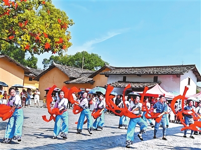 近日,在瑞金市红井革命旧址群,《苏区芳华》歌舞汇演吸引游客驻足观看。国庆、中秋假期,瑞金市以红色资源为依托,通过沉浸式体验活动与互动式教育模式相结合,全面推进红色基因传承。
