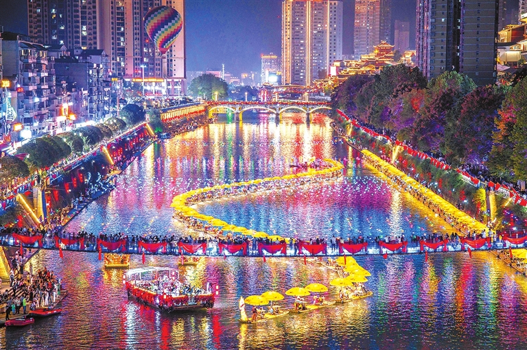 10月6日晚,游客在湖北省宣恩县乘坐竹筏欣赏夜景(无人机照片)。国庆中秋假期进入尾声,各地游客游兴不减,赏美景,品美食,乐享假期。新华社 发 (王法钧 摄)