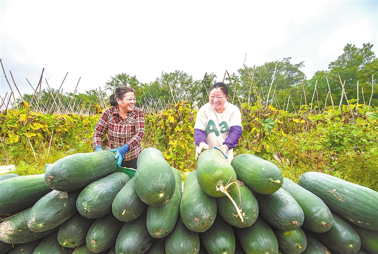 10月19日,信丰县大桥镇青光村蔬菜种植基地,村民抢抓农时采摘、搬运冬瓜。近年来,当地大力发展玉米、冬瓜、红薯等特色农产品规模化种植,以产业兴旺带动群众增收,为推进乡村全面振兴注入强劲动力。