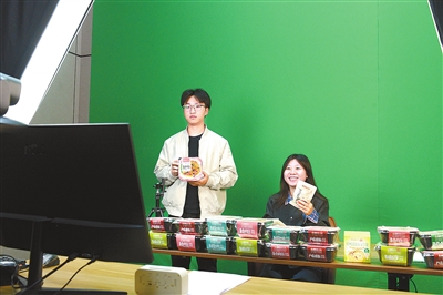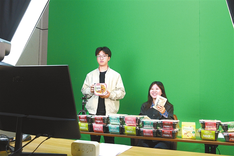 10月22日,在宁都县工业园区某公司内,工作人员正在直播销售特色风味自热食品。近年来,宁都县加大电商人才培育力度,采取线上直播的方式,销售宁都肉丸、宁都三杯鸡、盐焗鸡等特色产品,有效带动群众增收致富。