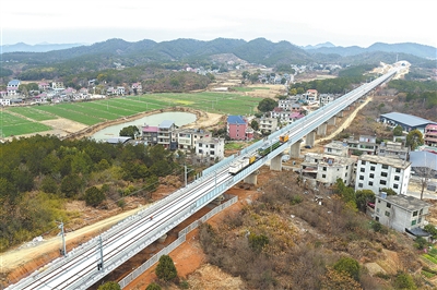 1月19日拍摄的昌九高铁庐山南站至共青城东站区段铺轨施工现场(无人机照片)。近日,昌九高铁庐山南站至共青城东站区段正抓紧铺设轨道。据介绍,昌九高铁铺轨施工预计2026年6月完成,2027年3月具备开通运营条件。昌九高铁是我国“八纵八横”高铁网京港通道的重要组成部分,连接江西省南昌市和九江市,正线全长138公里,设计时速350公里。线路建成通车后,将进一步完善我国高速铁路网布局,对于助力长江经济带发展、构建江西现代综合交通运输体系、进一步推进区域经济社会高质量发展具有重要意义。