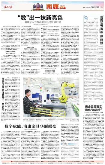 瞄准数字经济风口,近年来,南康区解放思想,应用5G、大数据、区块链、人工智能等新一代信息技术,全力推进家具产业补链、强链、延链。今年初,“江西省赣州南康智能家居产业集群”成功跻身工信部先进制造业集群项目,标志着南康家具产业数字化、智能化水平进入“国家队”。