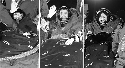 航天员陈冬(中)、刘洋(右)、蔡旭哲安全顺利出舱。新华社 发