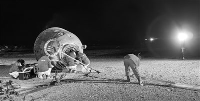 随着“砰”的一声巨响,耀眼的橘黄色火焰从飞船返回舱底部喷薄而出,缓冲发动机点火成功,返回舱稳稳降落在戈壁滩上。轰隆隆的螺旋桨声、地面飞驰的车队声、对讲机中的调度声,一时间汇成了迎接英雄回家的交响曲。